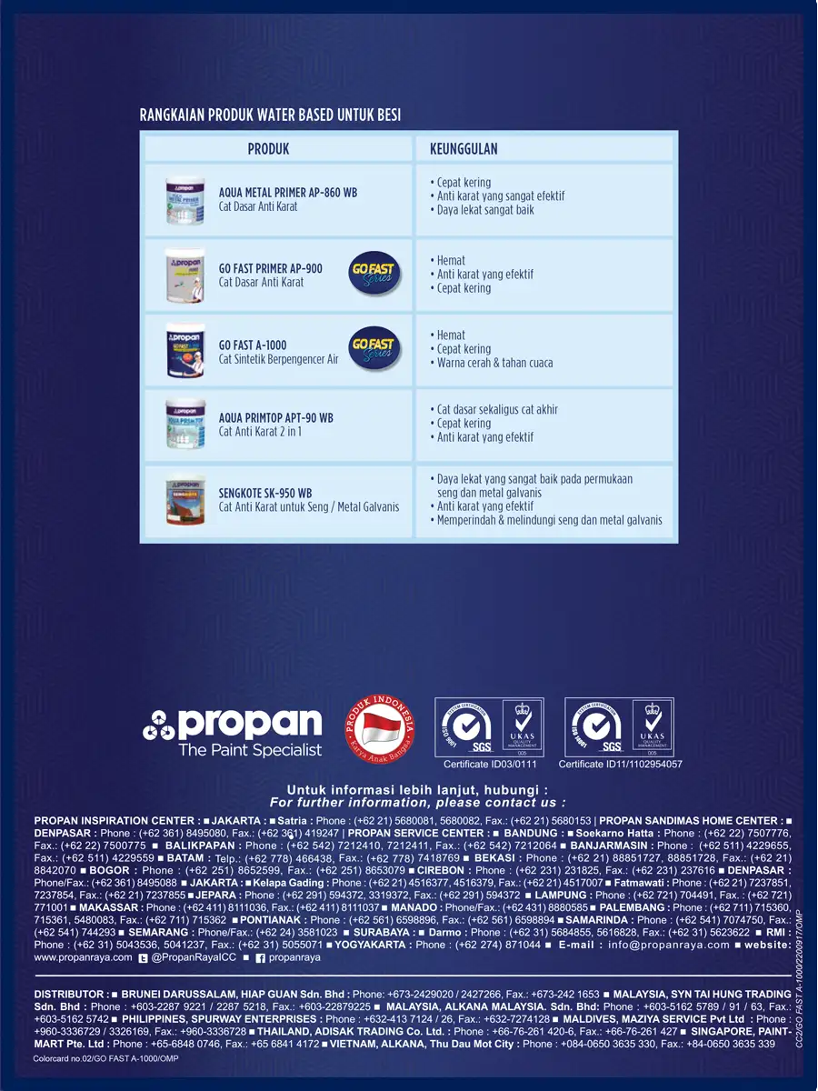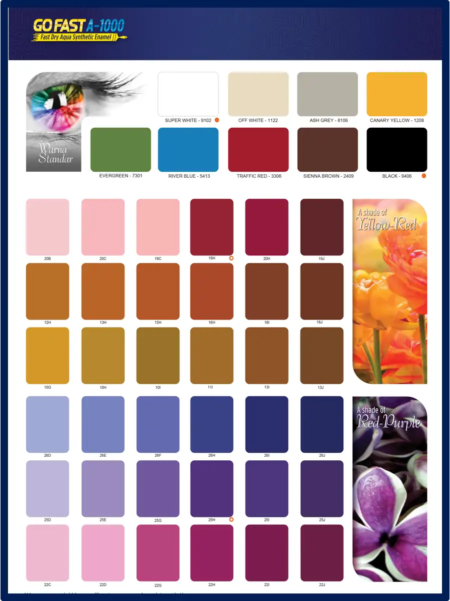 GO FAST A-1000 adalah cat sintetik serba guna berpengencer air yang cepat kering, mempunyai daya lekat yang kuat ke substrat, tahan cuaca, mudah diaplikasikan, warna tahan lama, tidak mudah pudar, mempunyai daya tutup yang baik, ramah lingkungan dan tidak beracun. GO FAST A-1000 sangat tepat diaplikasikan pada besi, kayu, beton, papan fiber cement, fiberglass, dll, baik di luar maupun di dalam ruangan.